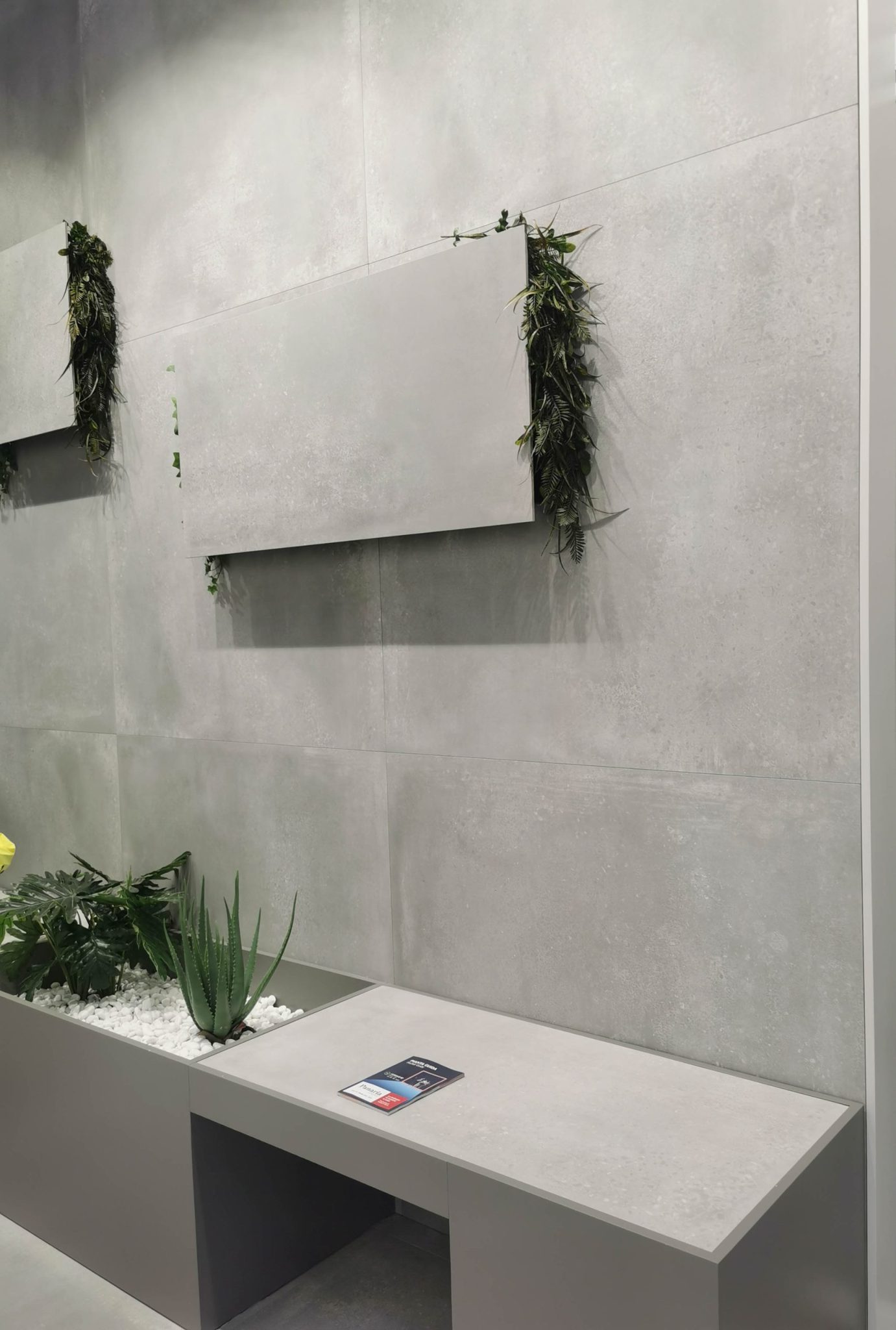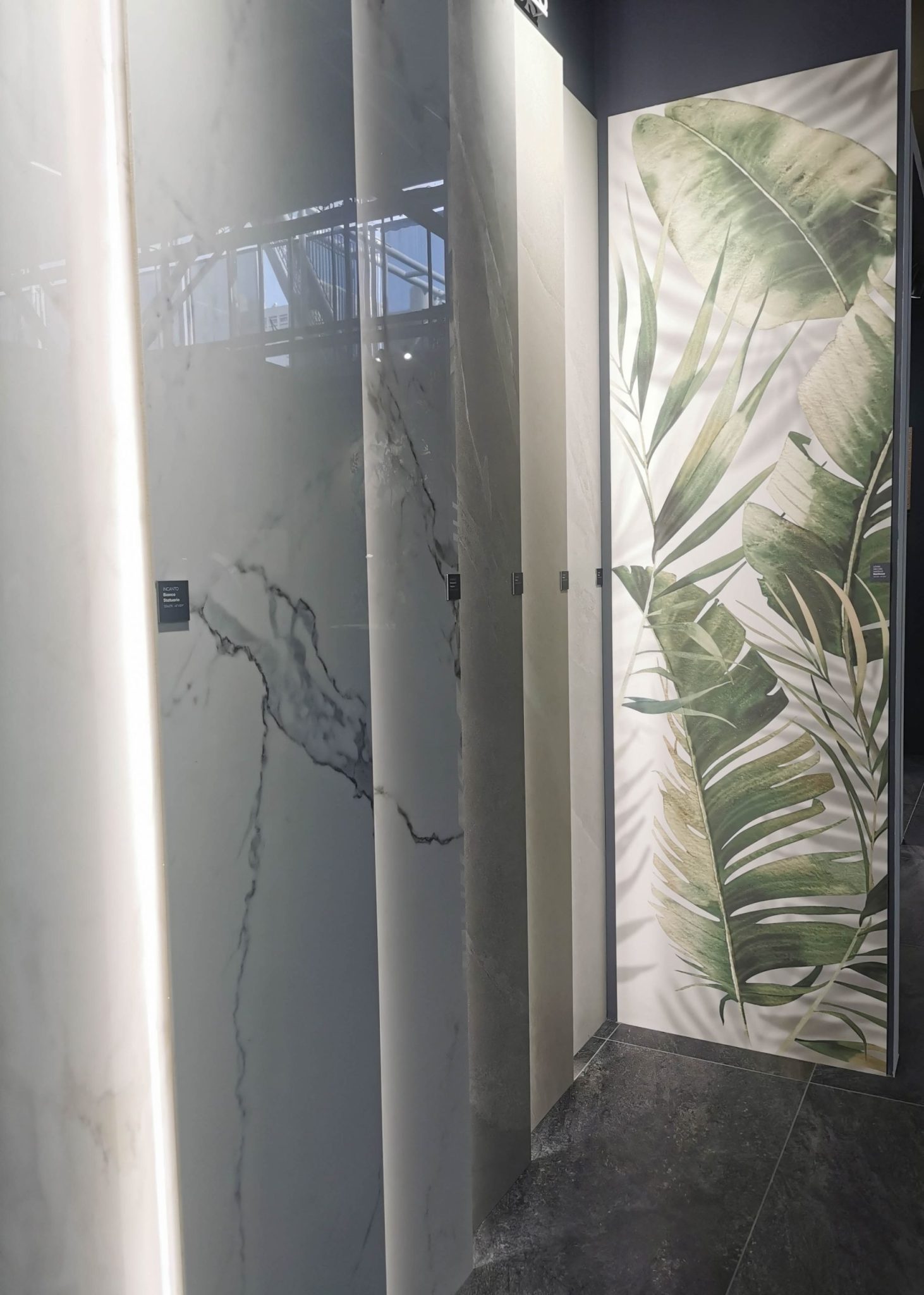 Die realistische Naturstein-Optik moderner Fliesen war herausragend: Bookmatch-Marmor und Terrazzo-Designs in XXL‑Format, oft glatter und pflegeleichter als das Original. Die Adern verlaufen nahtlos über Kanten hinweg dank feinster Digitaldruck-Technik – ein Highlight für elegante Bad- und Küchenlösungen.