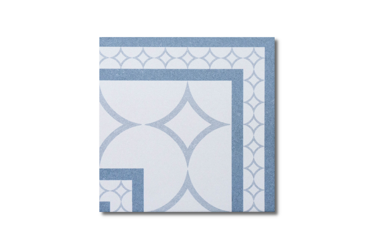 Die Bordüre in den Farben blau, weiß und grau ist ein pflegeleichtes Feinsteinzeug im Vintage- bzw. Retro-Stil. Sie ist für den Innen- und Außenbereich gedacht und kann als Wand- und Bodenfliese genutzt werden.