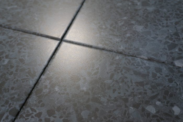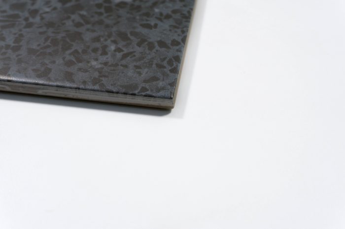 Die Bodenfliese in der Farbe grafit ist ein pflegeleichtes Feinsteinzeug in Terrazzo-Optik.