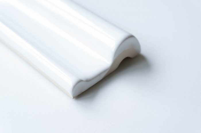 Die Bordüre in der Farbe weiß ist pflegeleicht, aus Steingut gefertigt und eignet sich auch als Abschluss. Die Fliesen dieser Serie sind mit einer dickeren Glasur überzogen, wodurch ein satter Glanz entsteht.