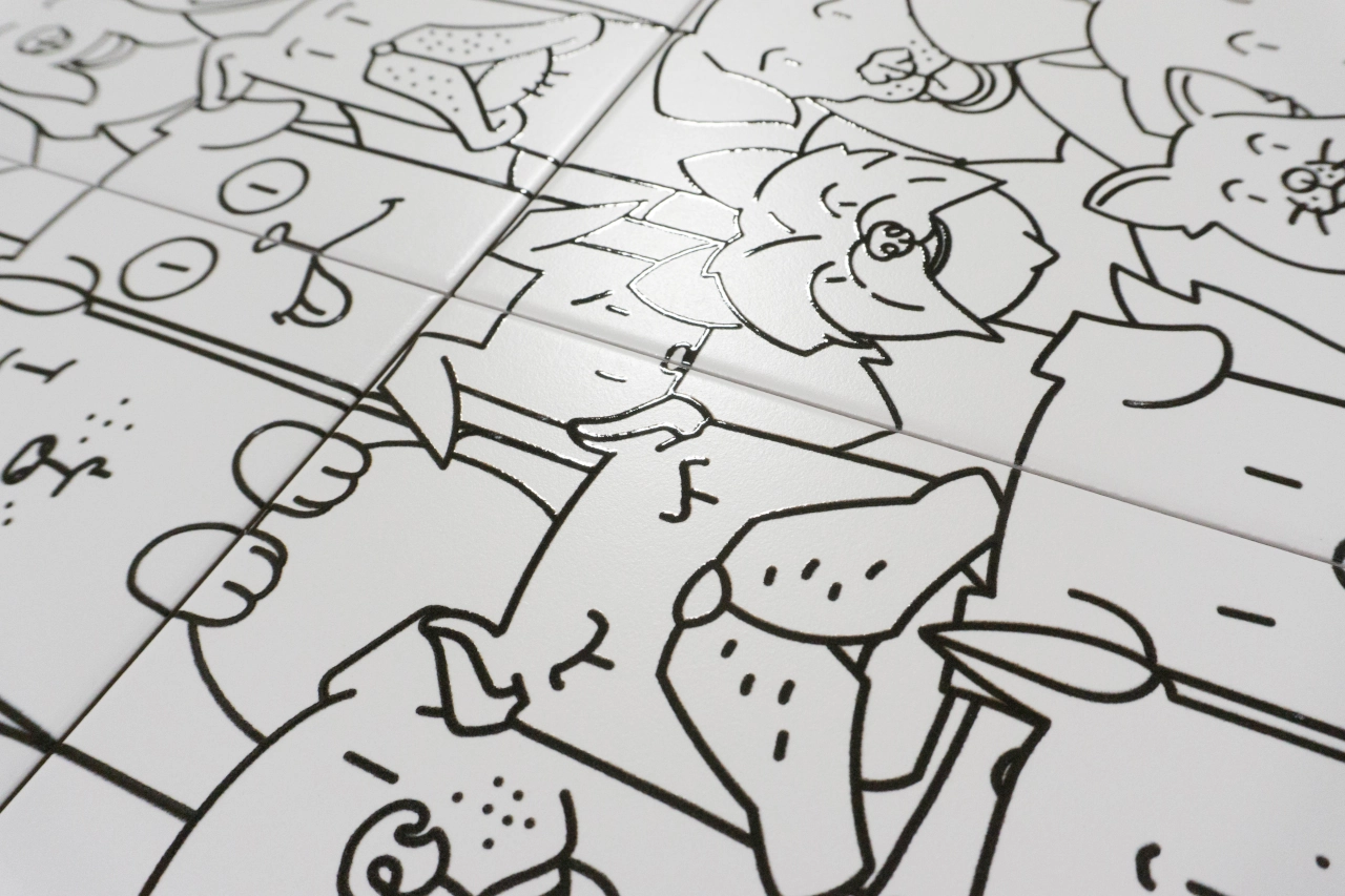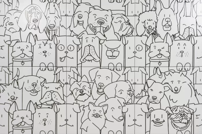 Die Wandfliese in der Farbe schwarz und weiß ist ein pflegeleichtes Feinsteinzeug mit Hundedekor und eignet sich auch als Bodenfliese.