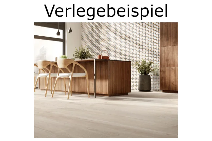 Die Holzoptik Bodenfliese in der Farbe creme ist ein pflegeleichtes und kalibriertes Feinsteinzeug.