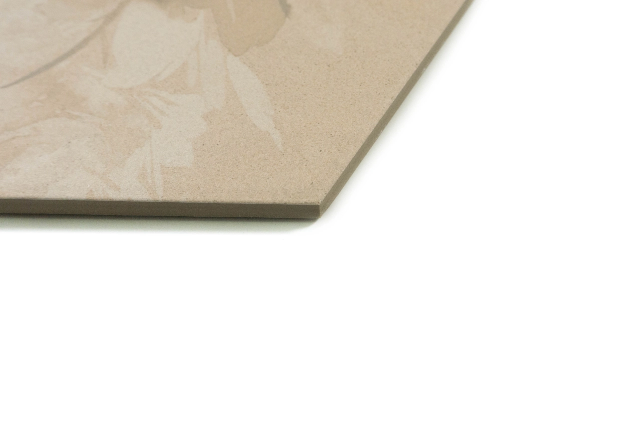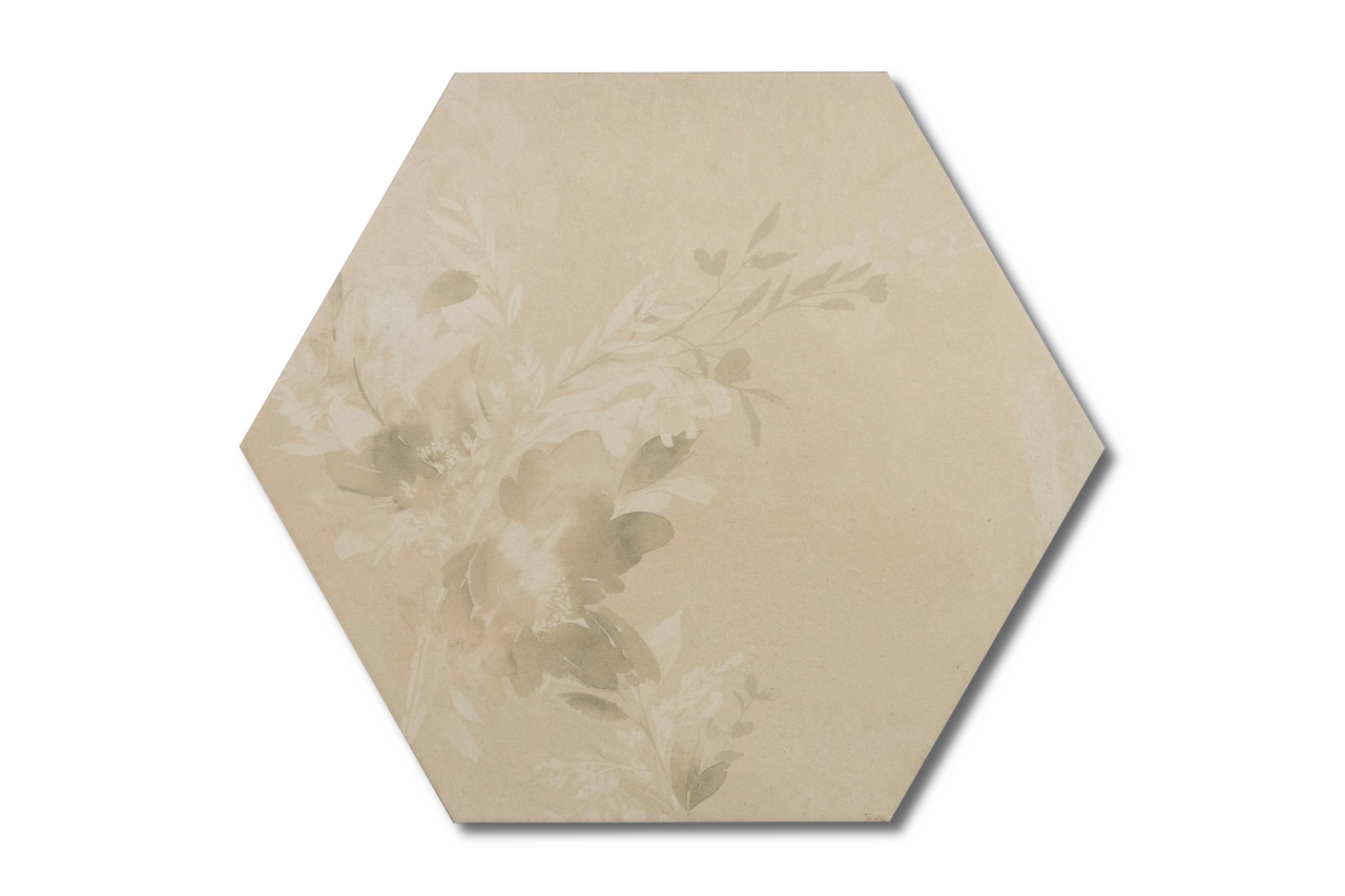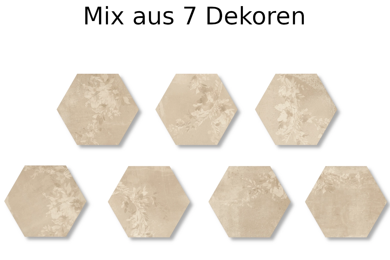 Die Fliese überzeugt durch ihre sanfte, erdige Farbgebung und eine dezente Oberflächenstruktur. Die Kombination aus natürlicher Optik und dekorativen Elementen macht diese Hexagon-Fliese zur perfekten Wahl für moderne sowie klassische Einrichtungskonzepte.