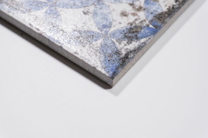 Das Dekor in den Farben schwarz, blau und weiß ist ein pflegeleichtes Feinsteinzeug im Vintage-/Retro-Stil.