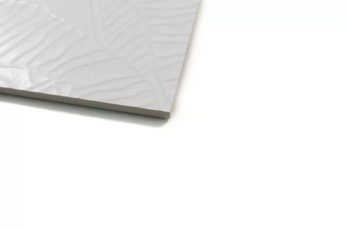 Die Wandfliese in der Farbe weiß ist ein pflegeleichtes weißscherbiges Steinzeug mit Relief.