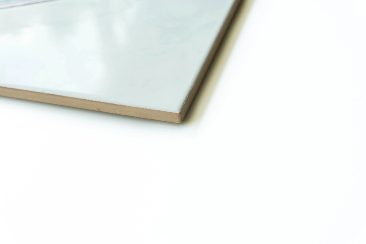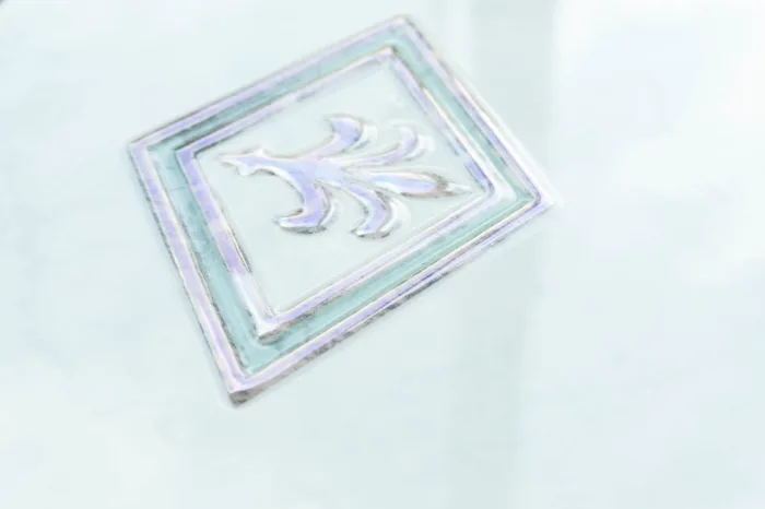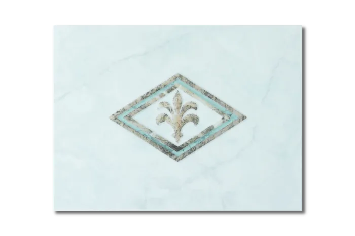 Die Dekorfliese in der Farbe weiß mit hellgrüner Marmorierung und Dekor in dunkelgrün ist ein pflegeleichtes Steingut mit Lustro Oberfläche und kann als Zwischenelement verwendet werden.